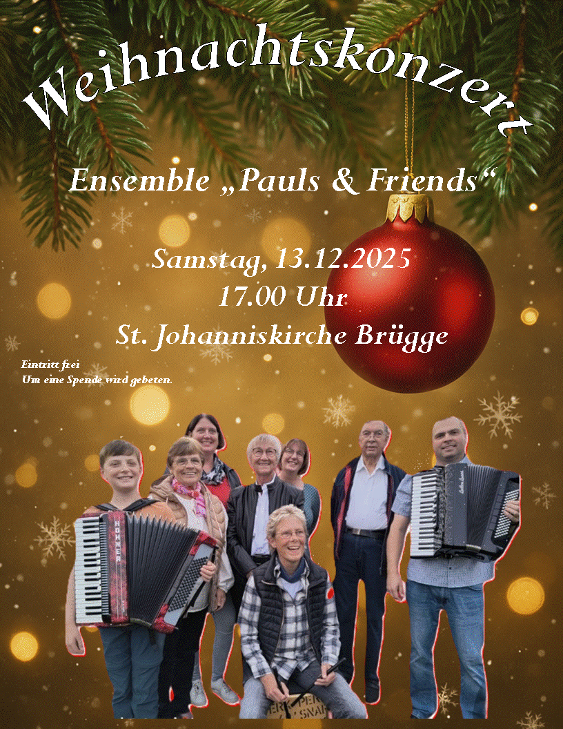 Am 13. Dezember 2025 spielt das Ensemble "Pauls and Friends" ein Weihnachtskonzert in der St. Johanniskirche. Den Flyer finden Sie hier.